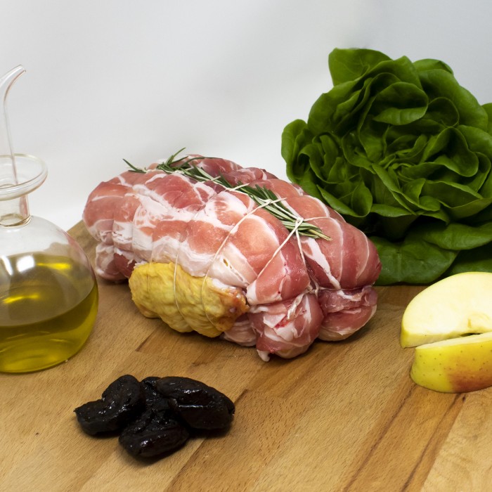 Arrosto fatto a mano con carne di cappone derivante da allevamenti Italiani selezionati ripieno con il nostro impasto (carne di pollo, carne di manzo, carne di maiale, sedano, carote, cipolle, sale, marsala, succo d'arancia, pane e cannella), prugne e mele.